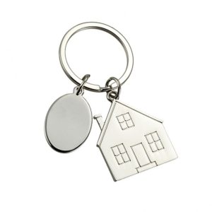Металевий брелок у формі будиночка з округлим шильдом. Оснащений кільцем для ключів.