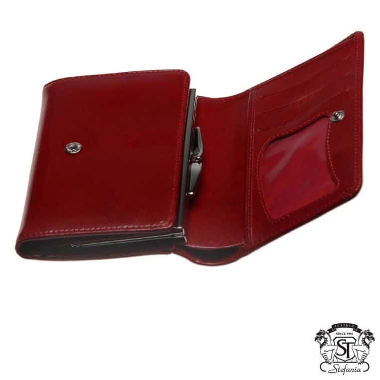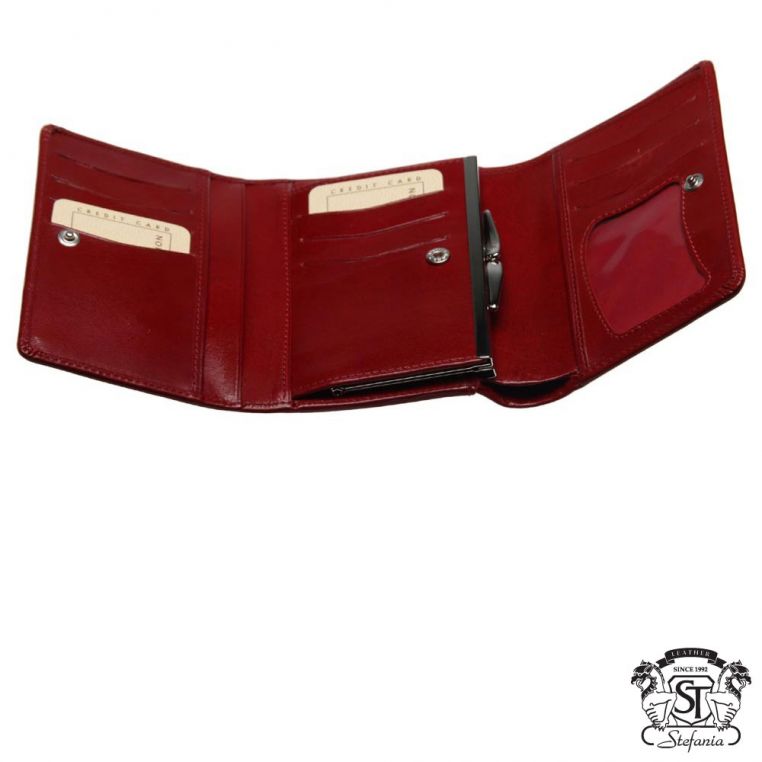 Жіноче портмоне із натуральної шкіри. Закривається на кнопку. Містить одне відділення для купюр, три додаткові кишені, одну кишеню для монет, дев’ять слотів для карток та одне вікно для посвідчень.